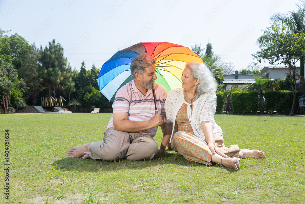 Happy senior indian couple sitting under umbrella at summer park in sunny day. Husband wife together.