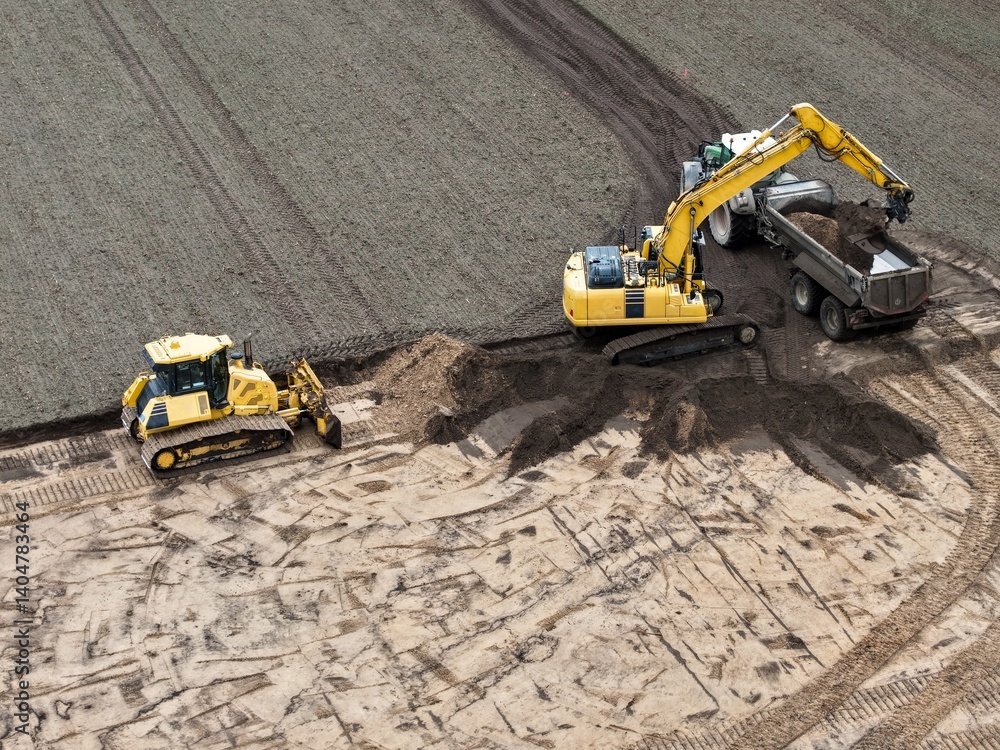 Excavator and bulldozer on a construction site, loads earth onto a tractor with dump truck, civil engineering, road construction, landscaping, earthworks, aerial view