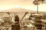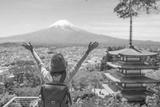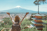 Happy young asian woman traveling in japan during spring at chureito pagoda with mt. fuji background – scenic and cultural tourism