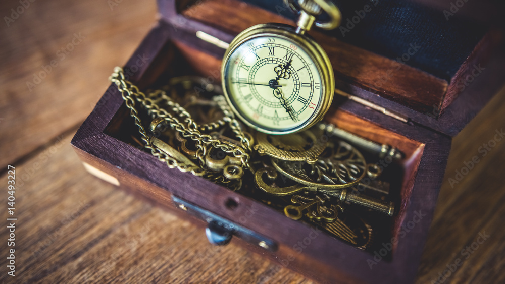 Vintage watch necklace and ocean adventure accessory tools in wooden treasure chest.