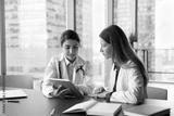Interactive learning in medicine. Skilled millennial female doctor therapist physician mentoring teaching young girl student intern at clinic workplace explain medical problem on digital tablet screen