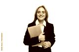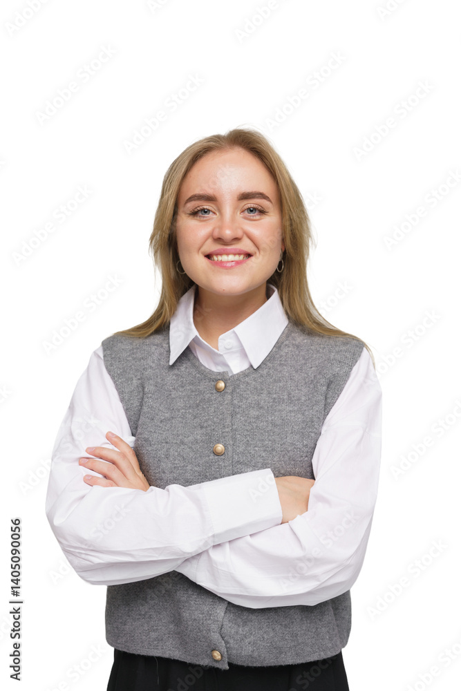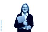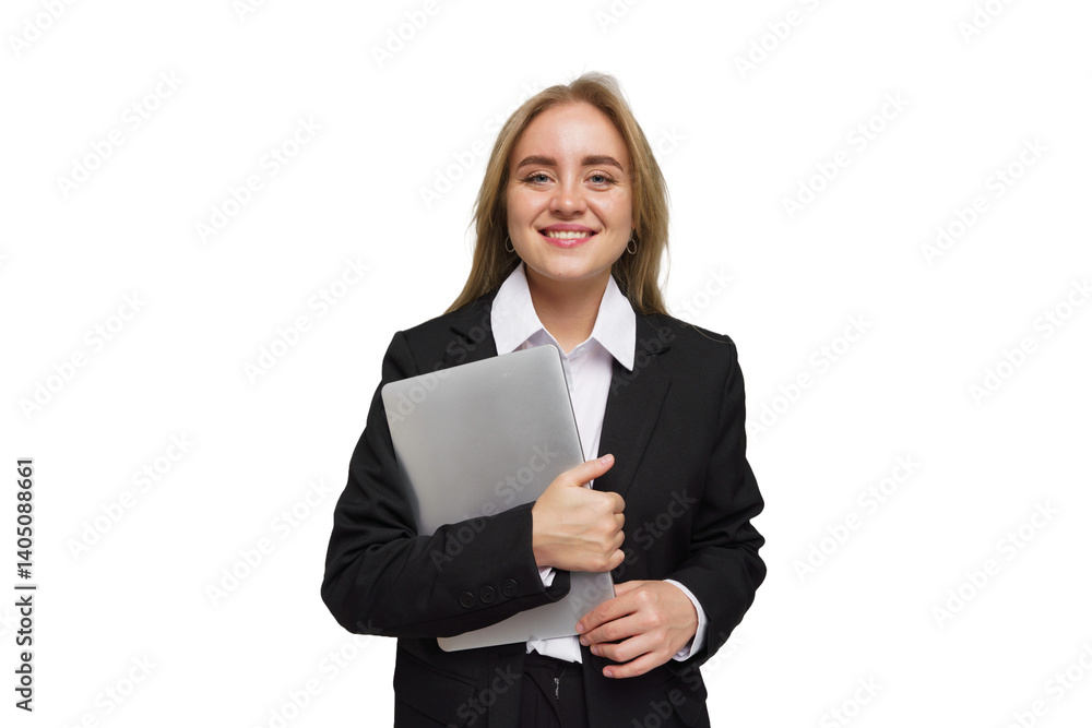 Professional Woman Smiles Confidently While Holding a Laptop in a Modern Office Environment During the Day