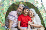 Happy retired indian grandparents with grandson camping inside tent. Family holiday and vacation.
