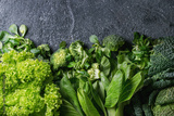 Variety of raw green vegetables salads, lettuce, bok choy, corn, broccoli, savoy cabbage as frame over black stone texture background. Top view, space for text