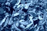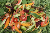 Zero waste, composting concept. Compost pile in garden close up top view. Bio waste, vegetables and fruits food scraps background, texture
