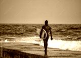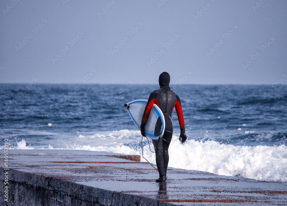 Surfer walks into ocean wearing a wetsuit in winter. Cold surfing. Wave splash. waterproof suit
