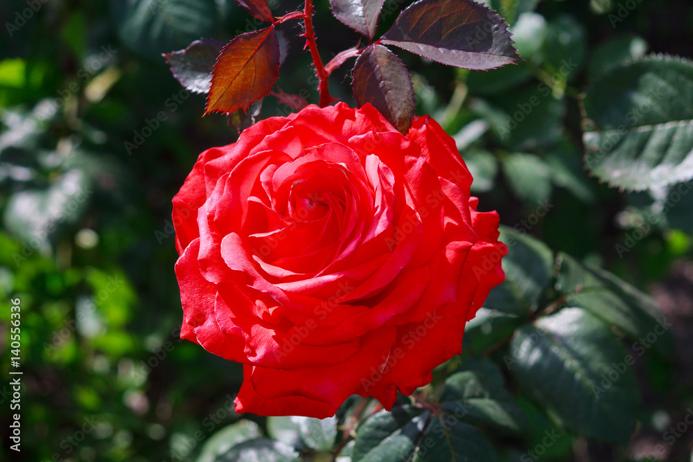 Beautiful red rose lit by the sun in the garden