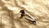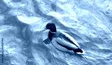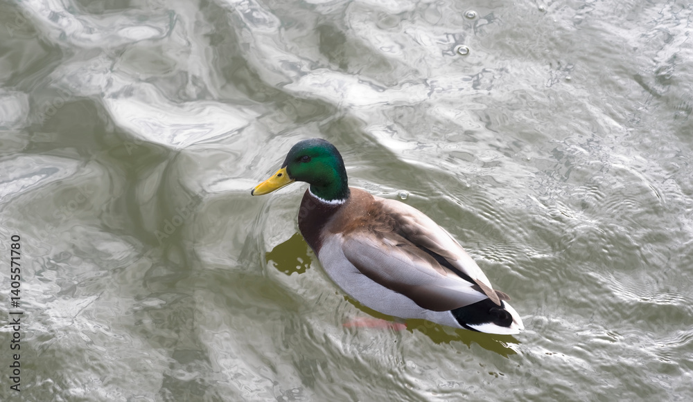 Samiec kaczki krzyżówki (Anas platyrhynchos) wiosennego dnia z żywą zieloną głową i żółtym dziobem sunie po falującej wodzie Jego upierzenie obejmuje brązową klatkę piersiową szare ciało i czarny ogon
