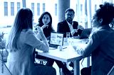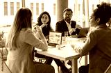 Businesswoman reviewing report on her laptop while discussing business growth with coworkers in meeting