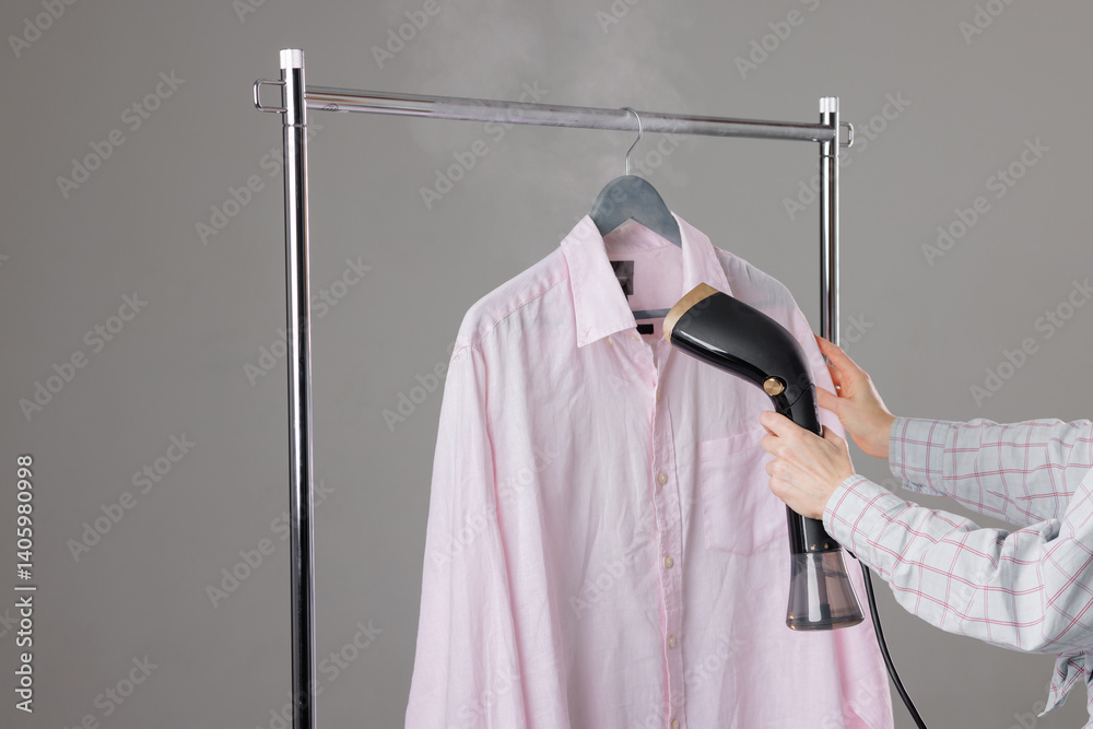 Steaming pink shirt on hanger with garment steamer, wrinkle removal and laundry care process.