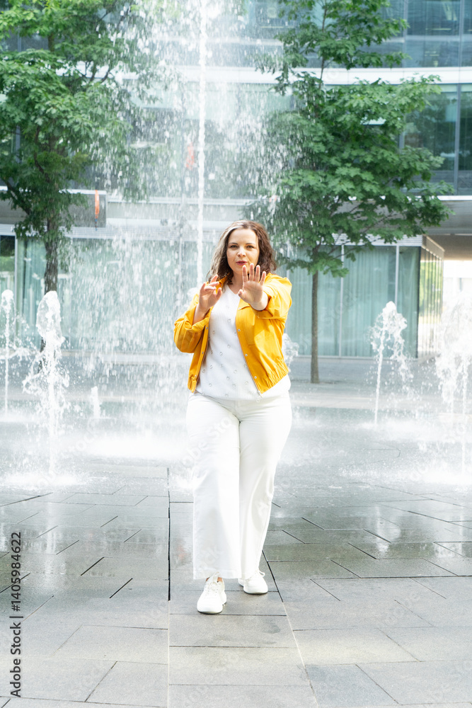 Happy curvy woman in city, plus size brunette lady with curly gray hair dancing emotionally in front of the fountains in modern city