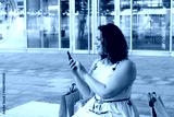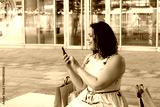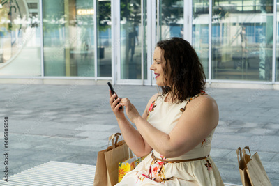 Happy curvy woman with ecological shopping bags sitting and talking on mobile phone enjoying in shopping. Consumerism, shopping, lifestyle concept