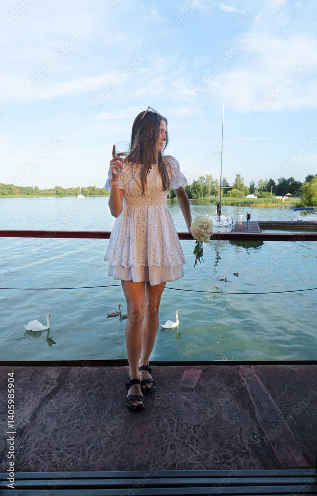 A joyful woman is celebrating by the peaceful water, holding vibrant flowers and enjoying the beautiful view around her