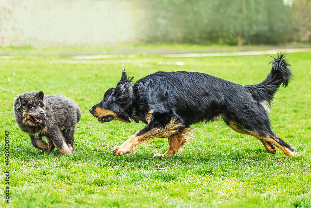 black and gold Hovie dog hovawart and a female Tibetan Mastiff puppy chasing around the park