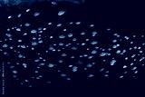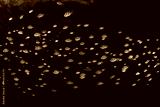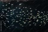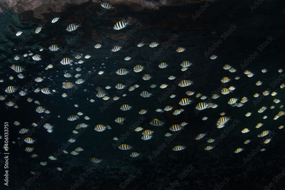 A school of sergeant major damselfish swims along the undercut of a limestone island in Raja Ampat, Indonesia. This area harbors extraordinary fish diversity.