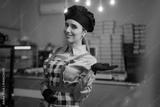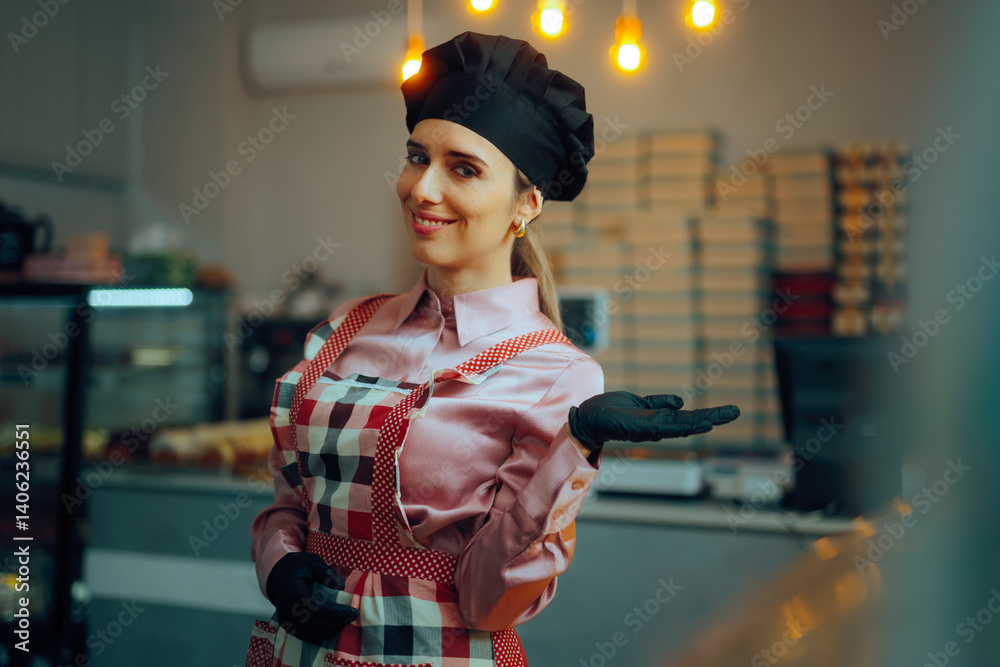 Confectioner Dressed in Uniform Presents Her Workplace. Small business owner proudly showing his bakery shop