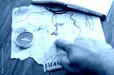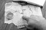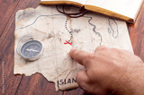 Man hand point by finger into red cross on Fake treasure map of pirate island. Adventure concept background