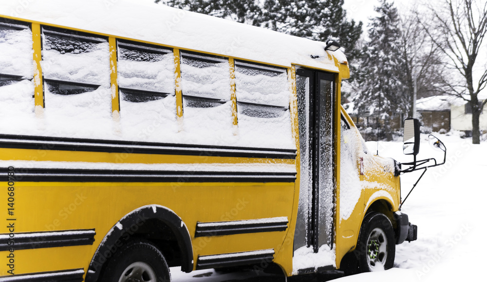 School bus parked in a residential neighborhood during a snow day while kids are home