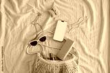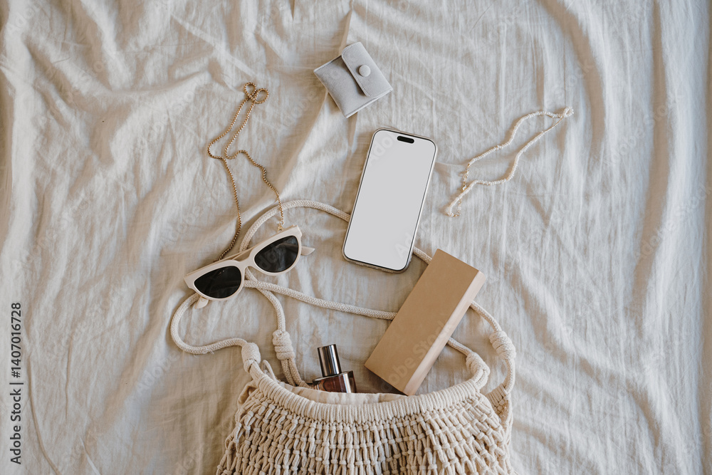 Flat Lay of Casual Summer Accessories. Stylish Arrangement of Smartphone, Sunglasses, and Minimal Accessories with Eco Bag, Neutral Setting