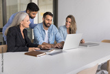 Workplace training and development. Skilled millennial male mentor team leader boss gather multicultural colleagues group on mentoring session teach explain work in online corporate app using notebook