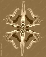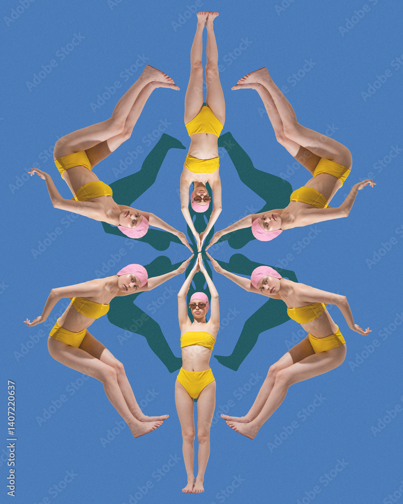 Artvisual collage. Pink-capped swimmer in yellow suit surrounded by mirrored clones in circular pattern, creating illusion of motion. Concept of summer, vacation, holidays, sport, fashion and style.