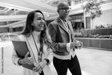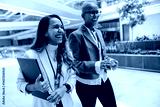 Two female professionals walking in modern corporate setting