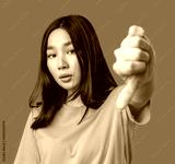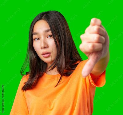 Young woman expresses disapproval with a thumbs down gesture on a bright green background