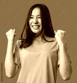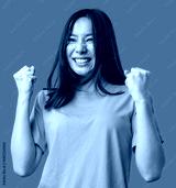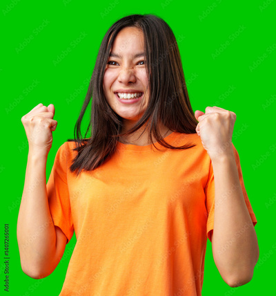 Excited young woman celebrating with raised fists in a bright orange shirt against a green background