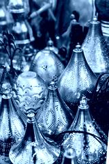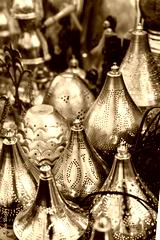 Intricate silver and gold lanterns on display at a bustling market during sunset
