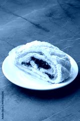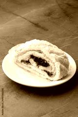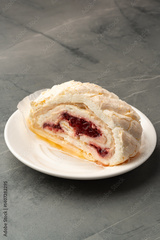 Delicious meringue roll filled with cream and cherry preserves on a white plate