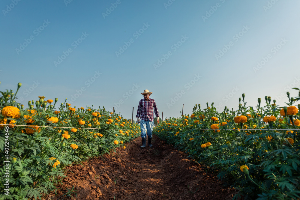 Elderly Asian farmer walking, inspecting blooming marigolds in field before harvesting. Smart farm, concept of agricultural business.