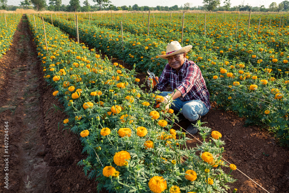 Smiling happy Asian senior male farmer holding pruning shears sitting in marigold plot and looking at camera.