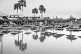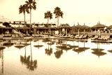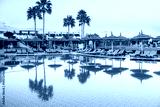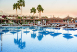 Tranquil resort pool area at sunset with palm trees and lounge chairs reflecting in calm water