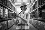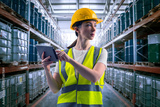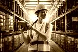 Customs registration. Girl with a scanner in the warehouse. Woman works on customs. Woman uses a barcode scanner. Passage of goods across the border. Customs officer registers postal items.