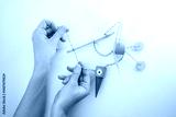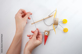 Hands assembling bird marionette toy made from cardboard, paper, string, pencil and plastic caps. Top view. DIY puppet and handmade bird craft concept for kids creativity and school projects