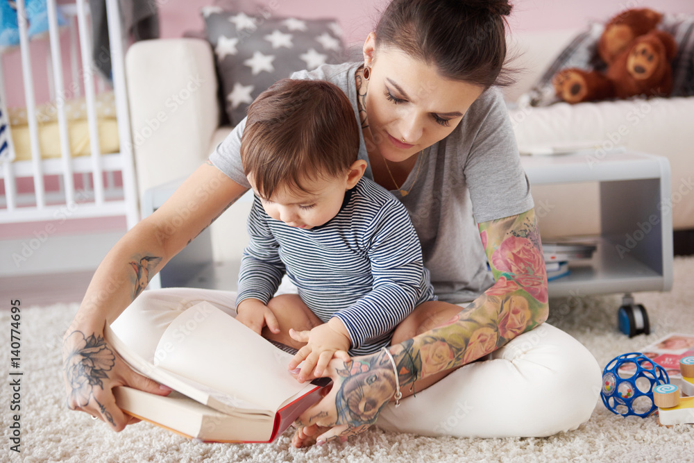 Mother reading book to her son