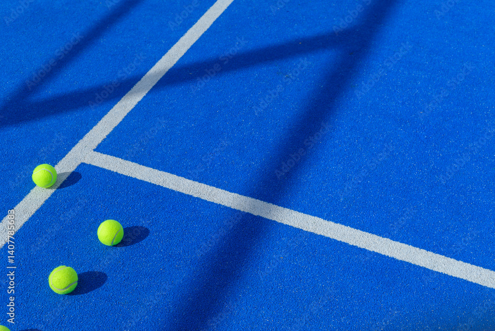 three balls in a padel tennis court blue artificial grass floor near the lines, racket sports background concept