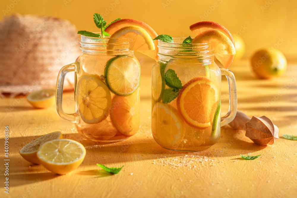Homemade lemonade as non alcoholic beverage on ice.