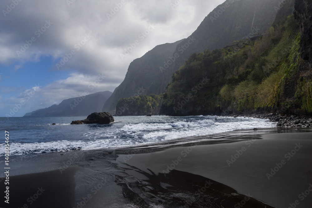 Beautiful Seixal Port Beach in Madeira features stunning black sand and dramatic cliffs under a cloudy sky