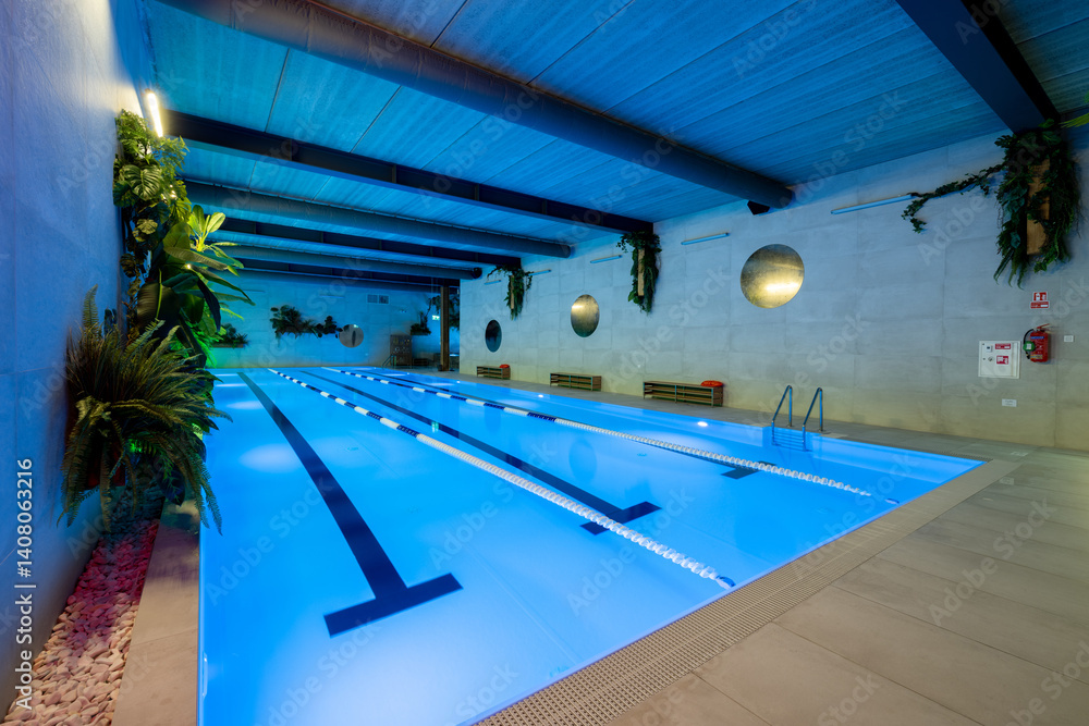 Modern Indoor Swimming Pool with Ambient Lighting and Green Decor