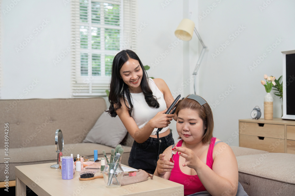 Hair and Beauty Styling. A woman curling her friend's hair while applying makeup.