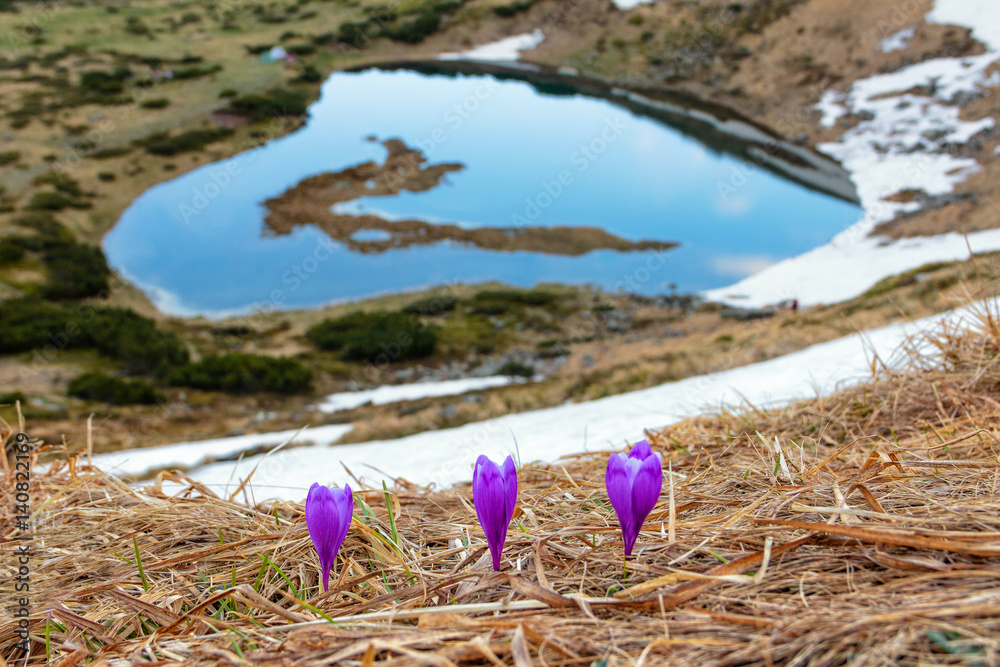 Landscape of spring lake in the mountains and the flowers crocus on foreground. National Park. Carpathians. Europe.
