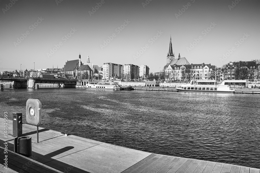 Black and white picture of Szczecin (Stettin) waterfront, boulevard view, Poland.