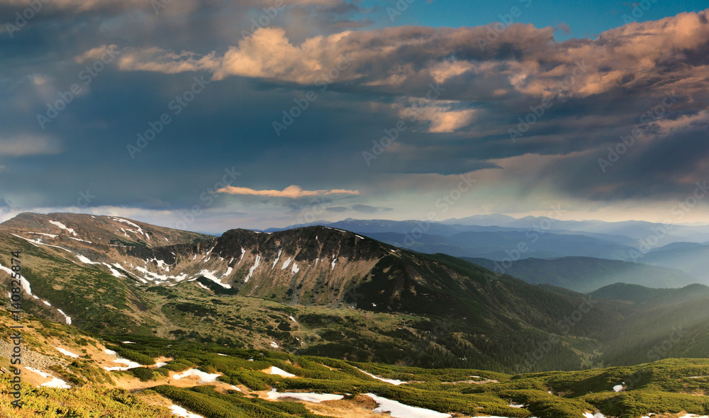 Beautiful landscape in the mountains at sunset. View of colorful sky with clouds.