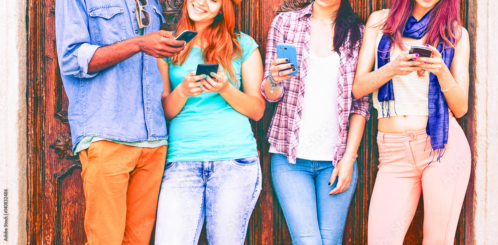 Group of teenagers texting mobile phone messages leaning against urban wall - Row of best student friends using smartphone wearing summer trendy clothing