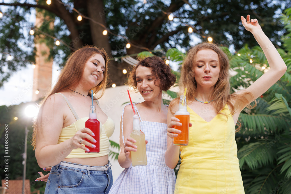 Happy women enjoying drinks at summer party with outdoor lights and festive atmosphere.