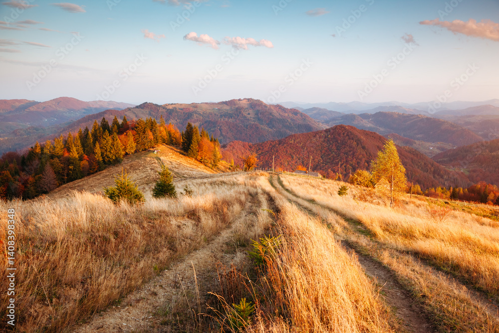 A magical autumn landscape of hilly terrain and colorful hillsides in sunlight. Carpathian mountains, Ukraine, Europe.