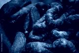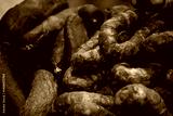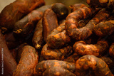 detail of smoked sausages made of pork meat called chouricos, typical gastronomy of northern portugal. Feira do Fumeiro event. Montalegre, Portugal