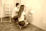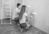 Portrait of happy young couple painting interior wall of new house or flat. They are holding rollers for painting.