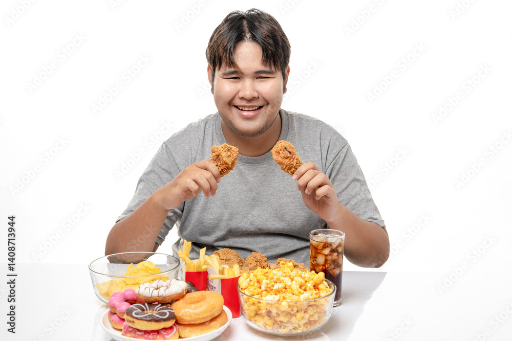 Smiling fat man holding fried chicken and unhealthy food on a plate, over white background